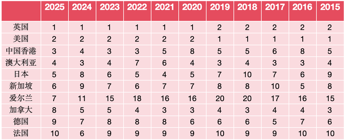 2015-2025年,意向留学人群的意向国家/地区排名 TOP10